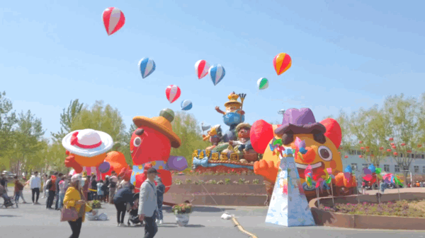 气球花车巡游的队伍从喷泉广场一路巡游至滑草场,周围的游客也纷纷加入了巡游的队伍,快跟着欢乐出发吧!